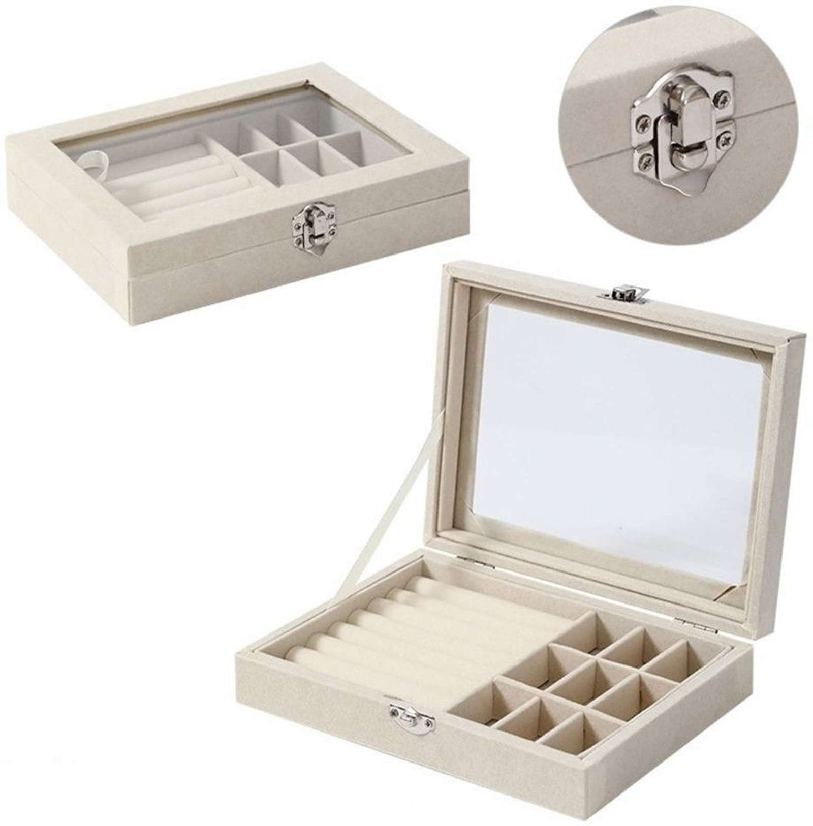 The jewellery box features a soft velvet-lined interior that helps reduce friction and surface scratches on accessories. The sturdy outer structure maintains shape and durability for regular use.