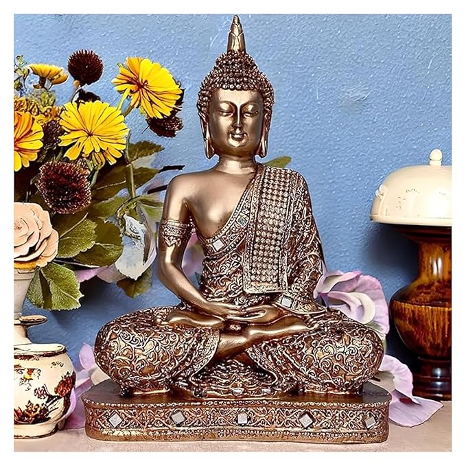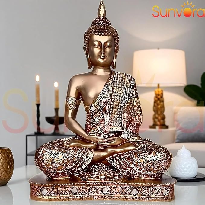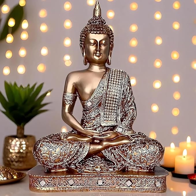 SPIRITUAL DECOR: Meditating Sitting Buddha statue in golden finish, perfect for creating a peaceful and serene atmosphere in your home, office, or temple space